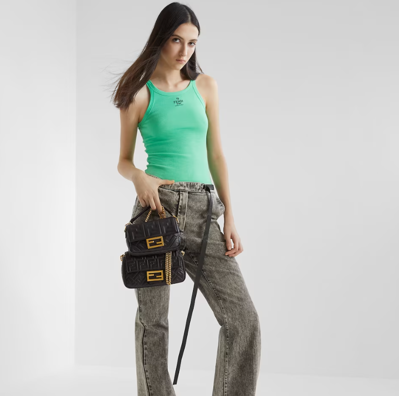 DetailIconic mini Baguette bag made of black soft nappa leather with a three-dimensional texture FF motif. Decorated with an FF clasp.Featuring a front flap, magnetic clasp, lined internal compartment with pocket and gold-finish metalware.The bag can be carried by hand, or worn either on the shoulder or cross-body thanks to the handle and chain shoulder strap, both detachable.Made in ItalyComposition: 100% lamb leather, inside: 50% cotton, 42% polyamide, 8% resinMeasurements:Height: 11.5 cmDepth: 4 cmWidth: 19 cmWeight: 0.6 kgStrap length (min): 120 cmStrap length (max): 120 cmShoulder strap drop: 58 cmProduct Code: 8BS017A72VF15ZW