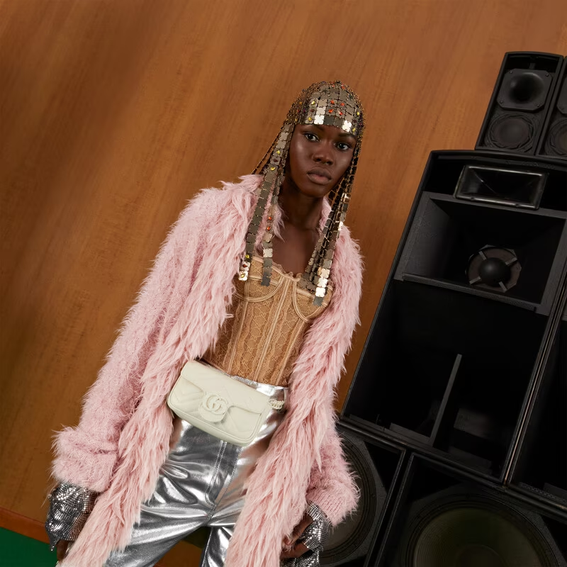 Accessories continue to come to the fore of the Creative Director's collections. A distinctly contemporary accessory, the belt bag is presented in new ways throughout the Gucci narrative, emphasizing different elements of the versatile style. Here, it is introduced as part of the GG Marmont universe in white chevron matelassé leather with a chain strap.