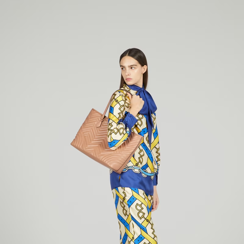 With its recognizable matelassé fabric and Double G hardware, the GG Marmont has become synonymous with the House. Continuously reinvented through the seasons, new shapes are introduced within this signature line, matching Gucci's contemporary vision. This large tote bag reveals a chevron base, further enhancing the tonal logo hardware.