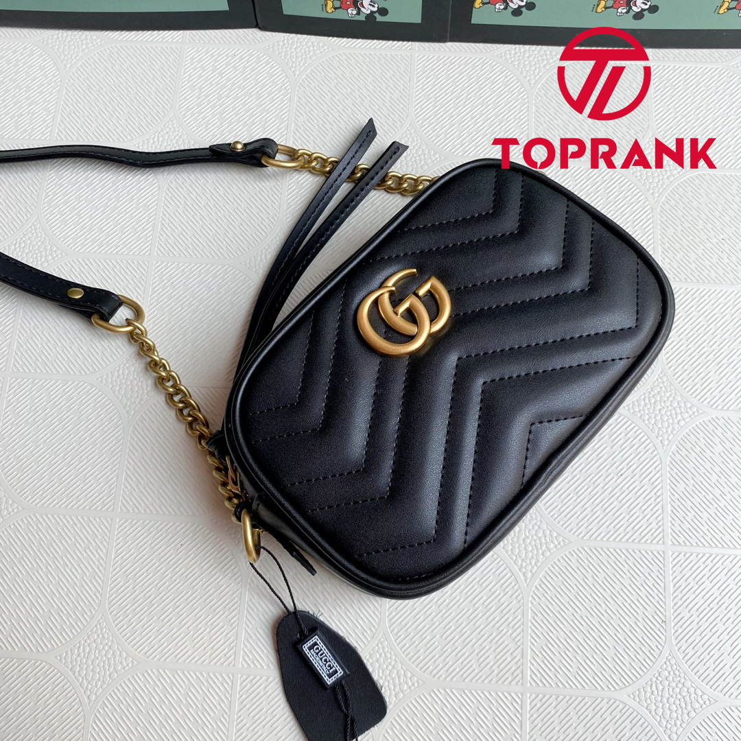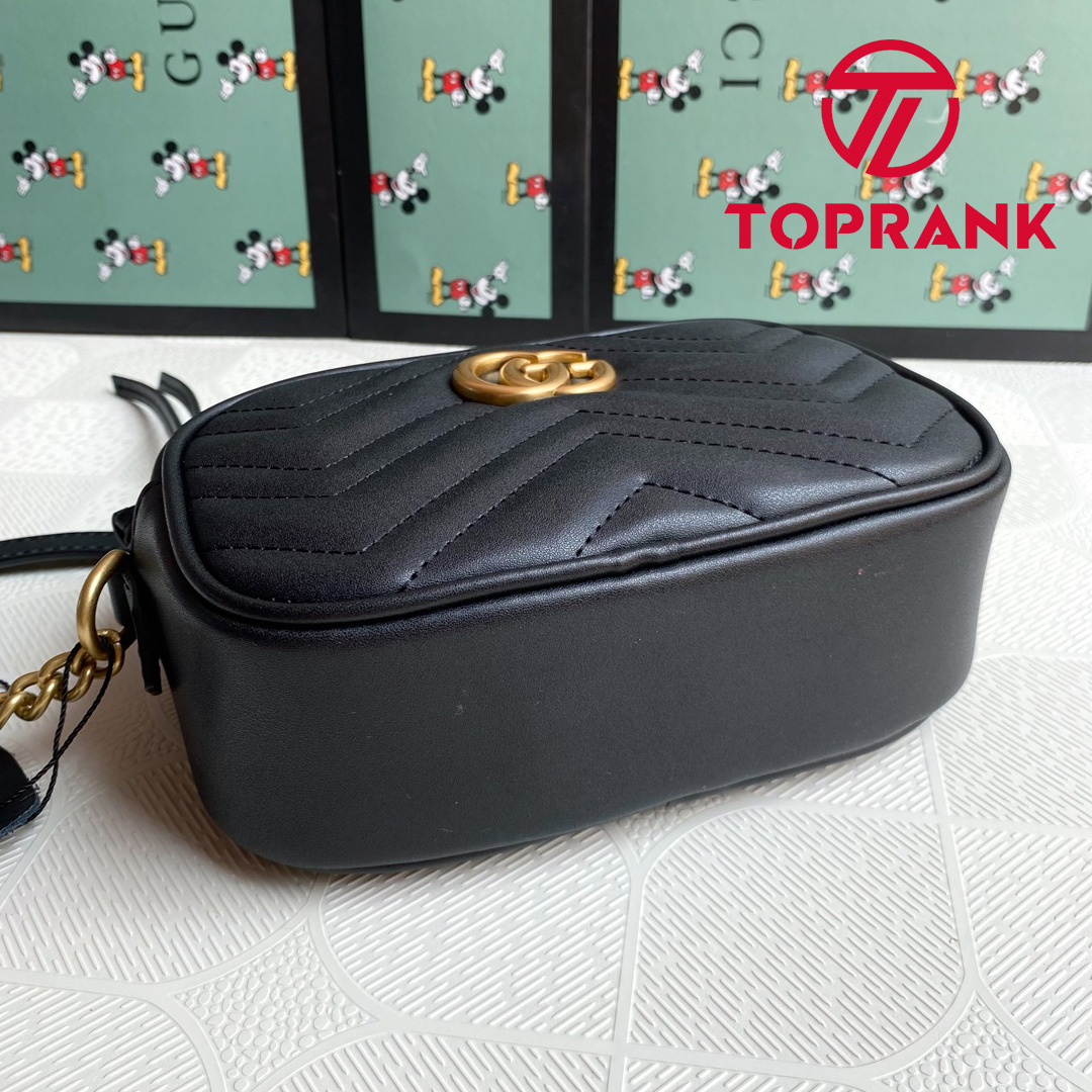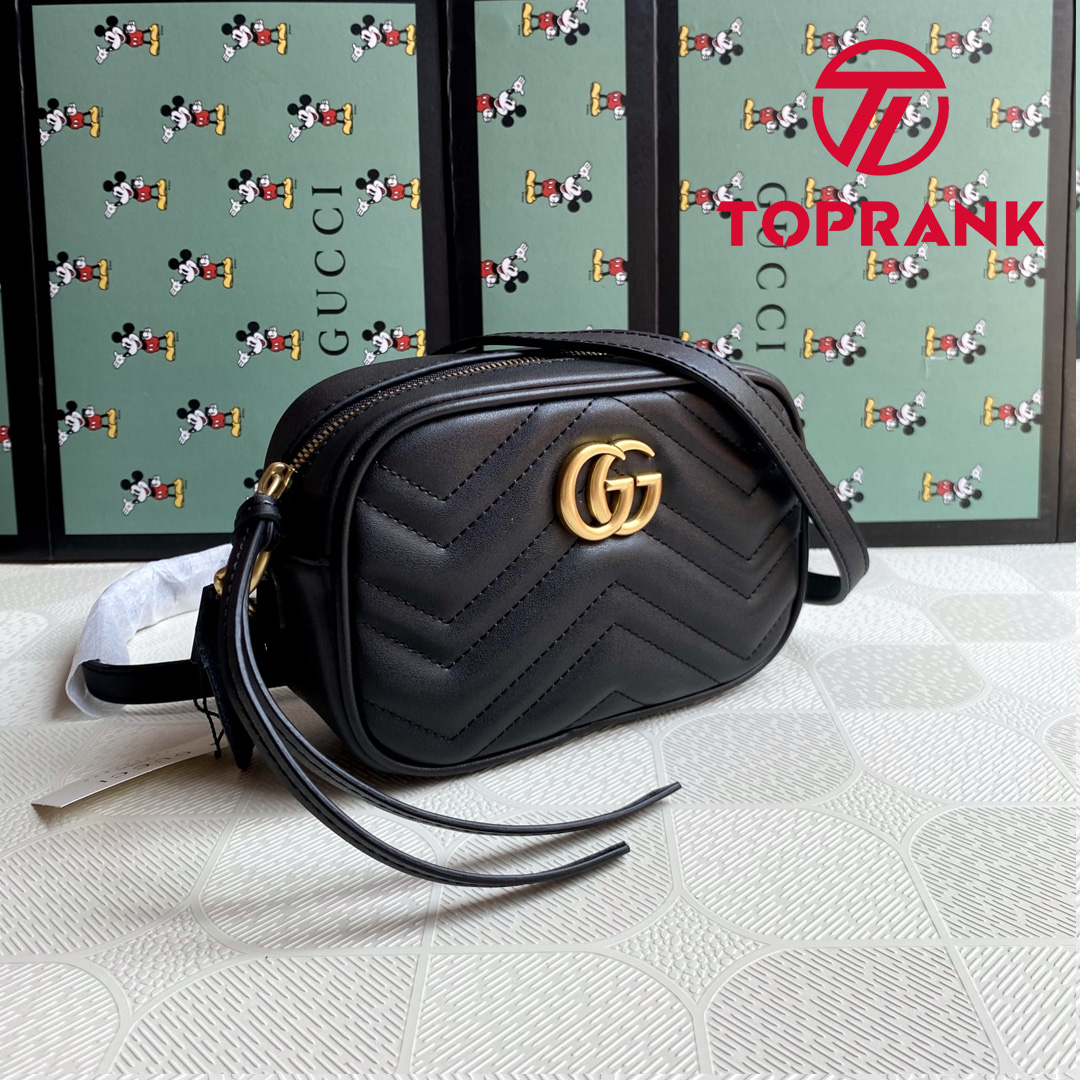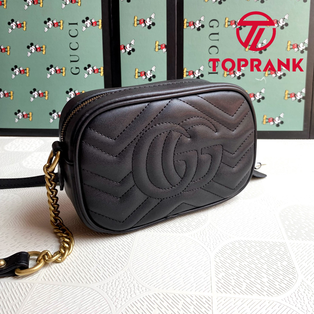 The mini GG Marmont chain shoulder bag has a softly structured shape and a zip top closure with Double G hardware. The chain shoulder strap has a leather shoulder detail. The camera bag is made in matelassé leather with a chevron design and GG on the back.