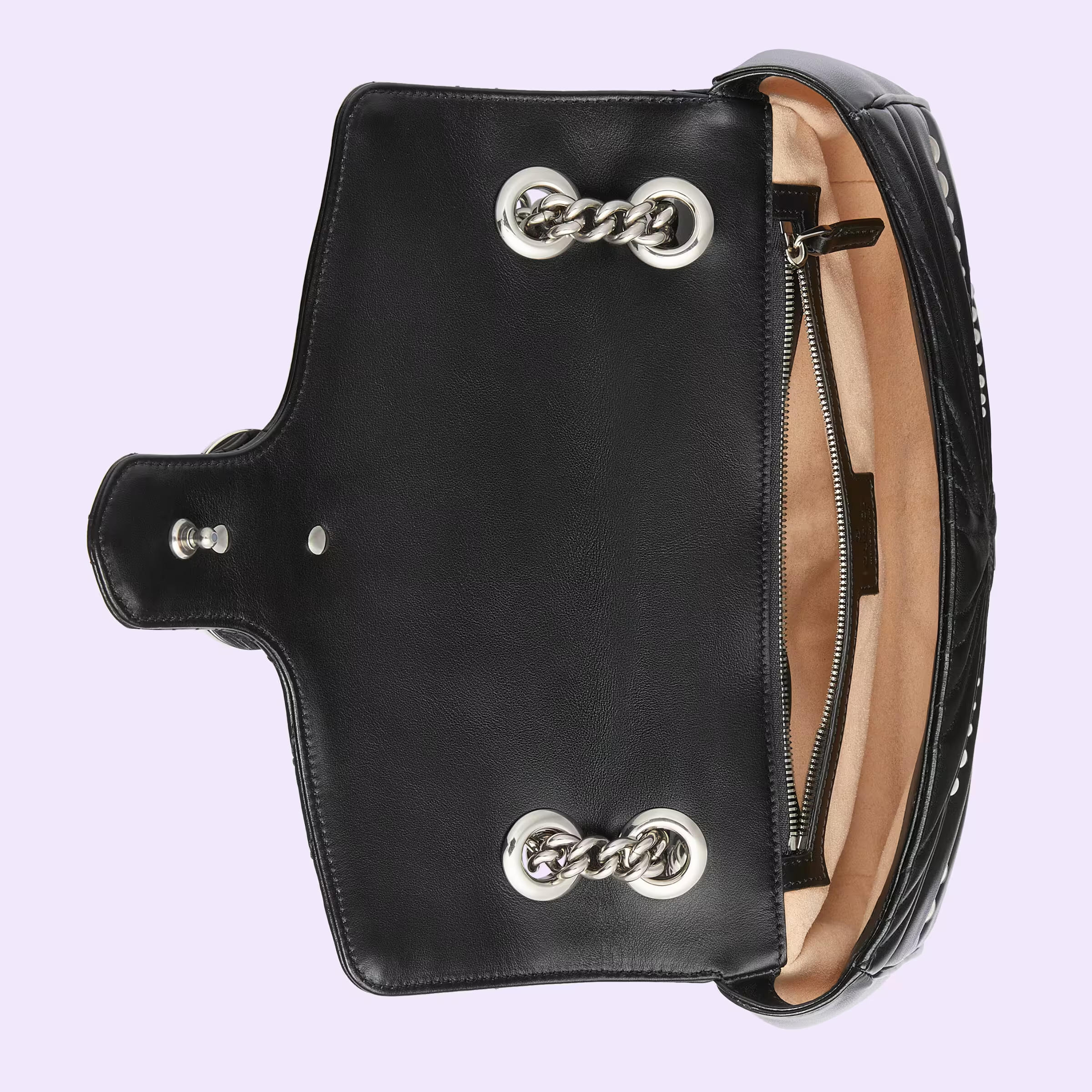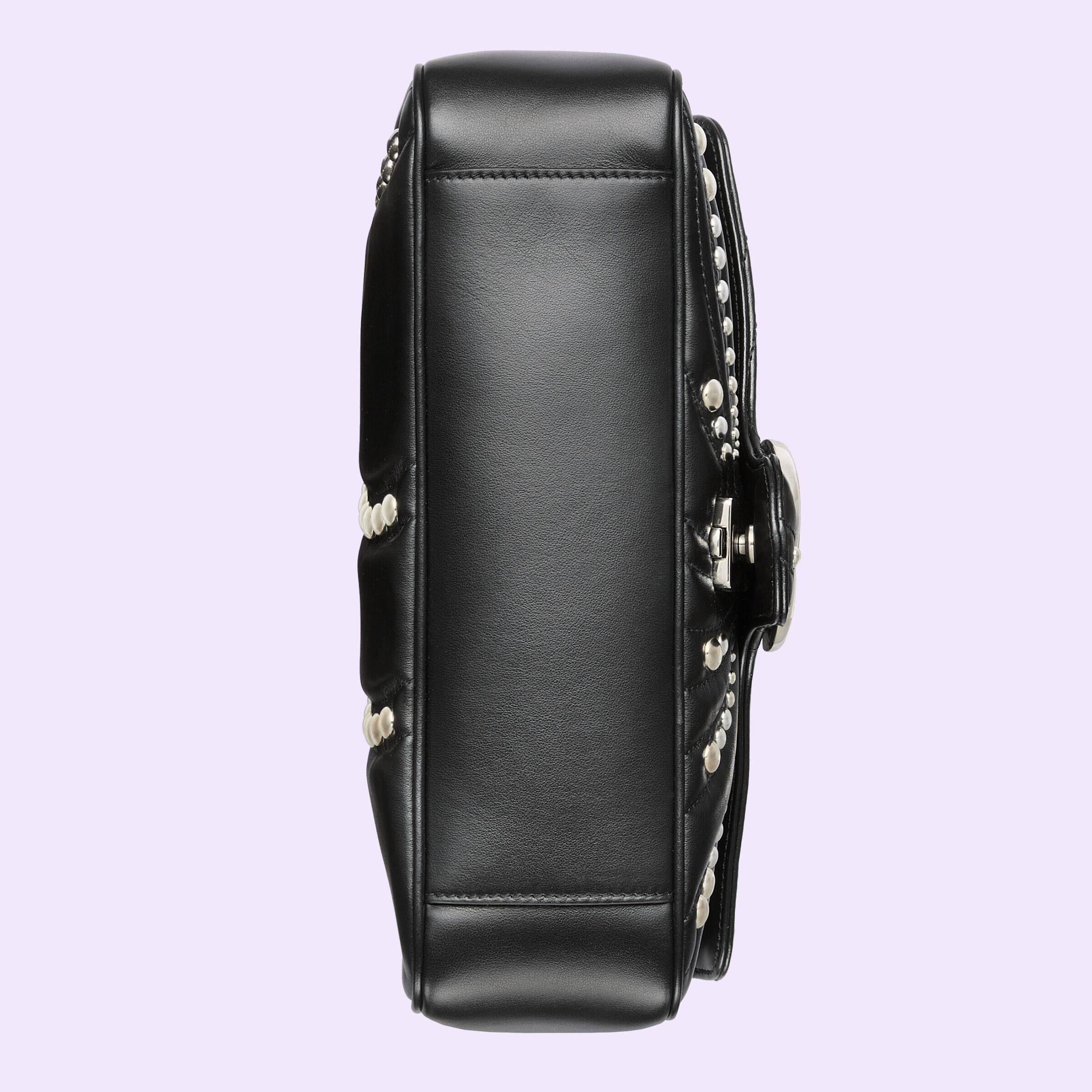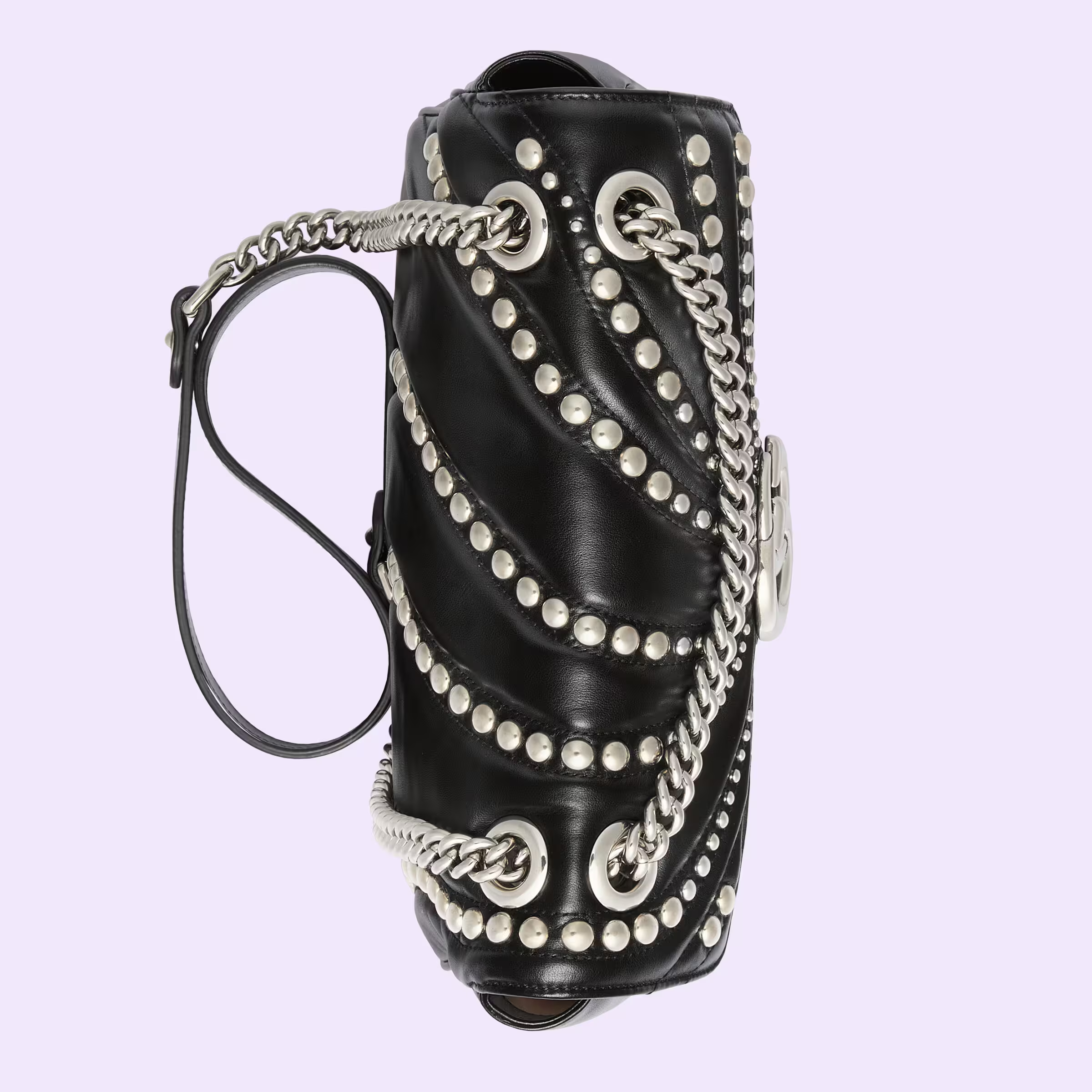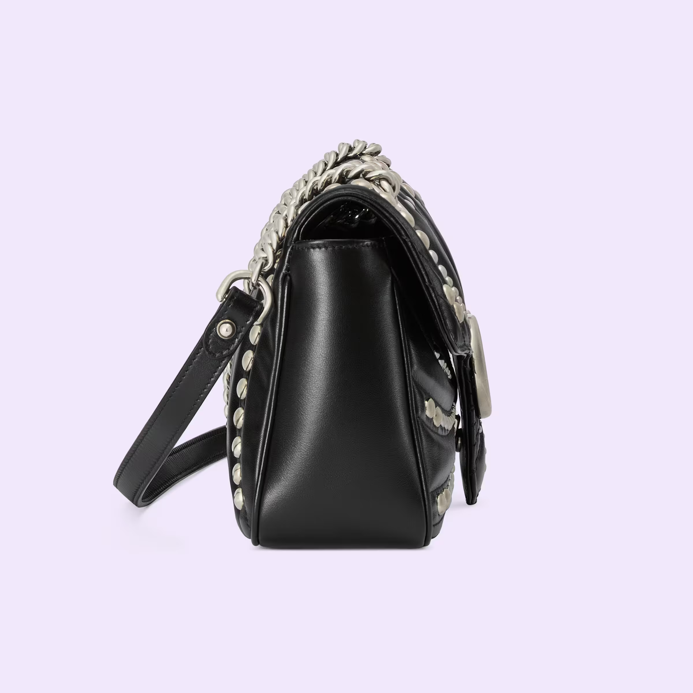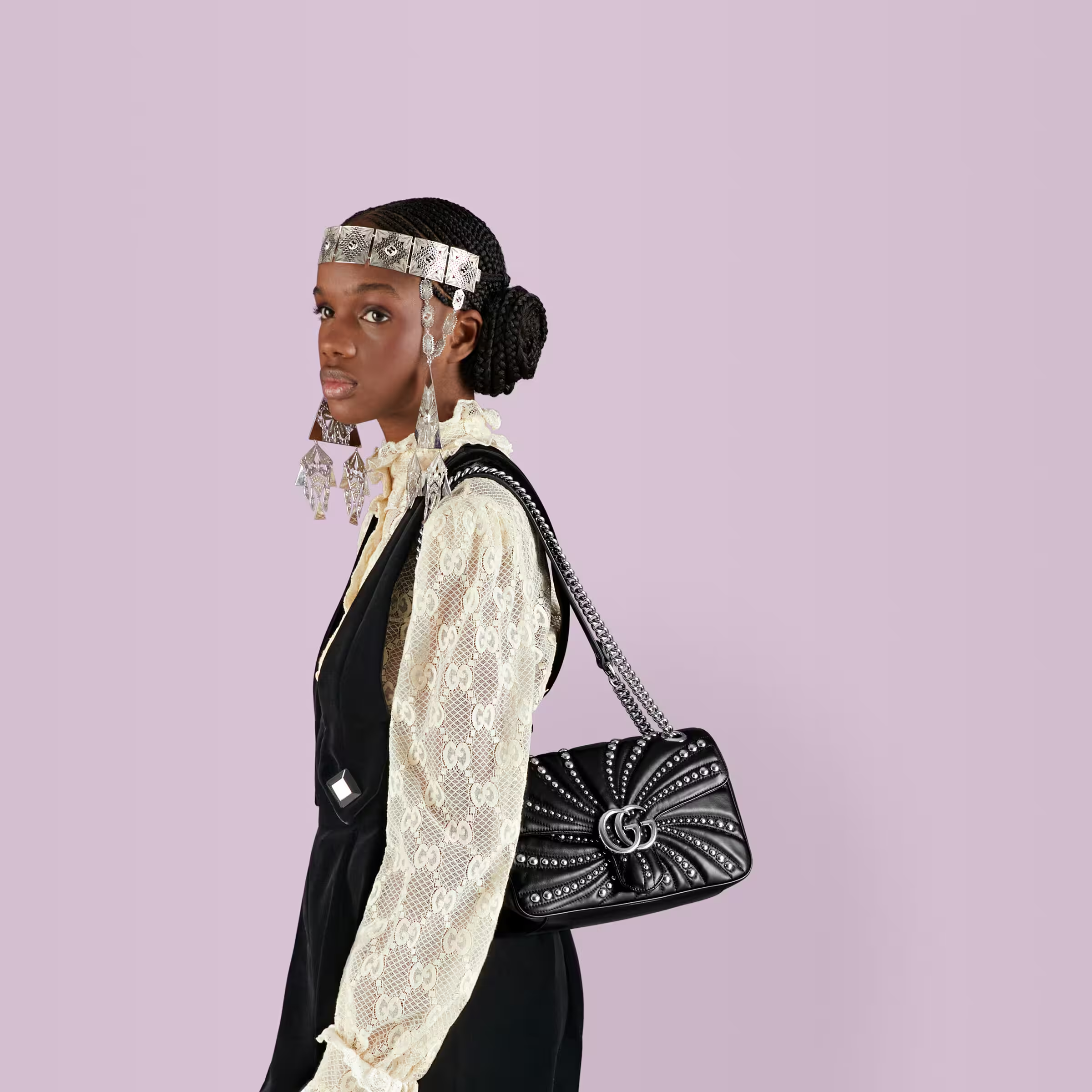 Heritage elements are reimagined with a contemporary twist throughout Cruise 2023 Gucci Cosmogonie. A nod to Gucci's Founder, the Double G has appeared throughout the House's collections season after season. Here, this GG Marmont is presented in black leather with a spiral stud detail, a nod to the rockstar theme that permeates the collection.