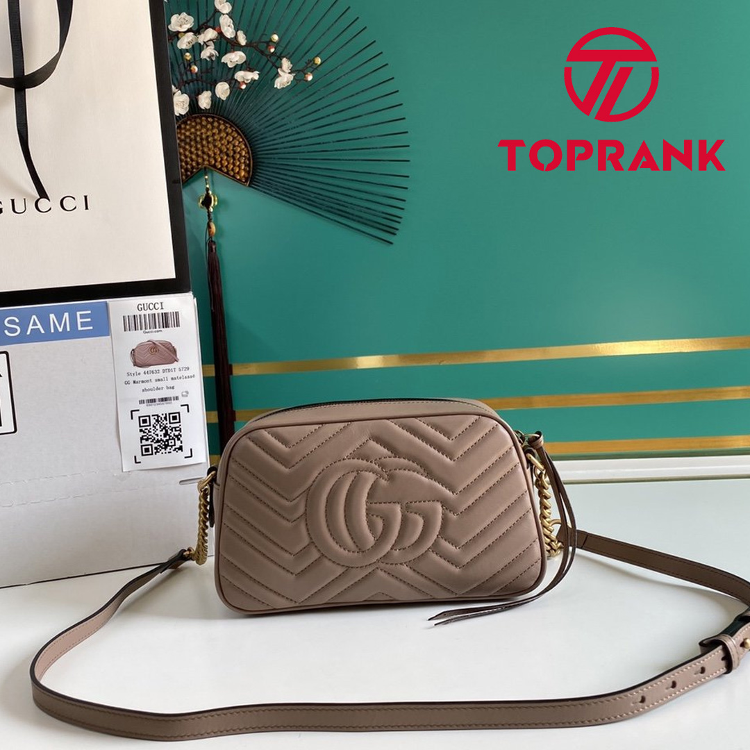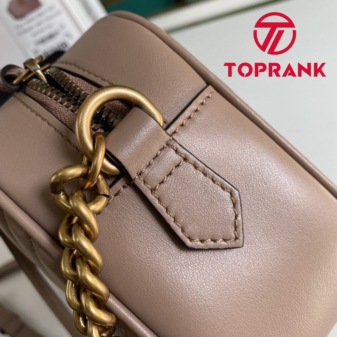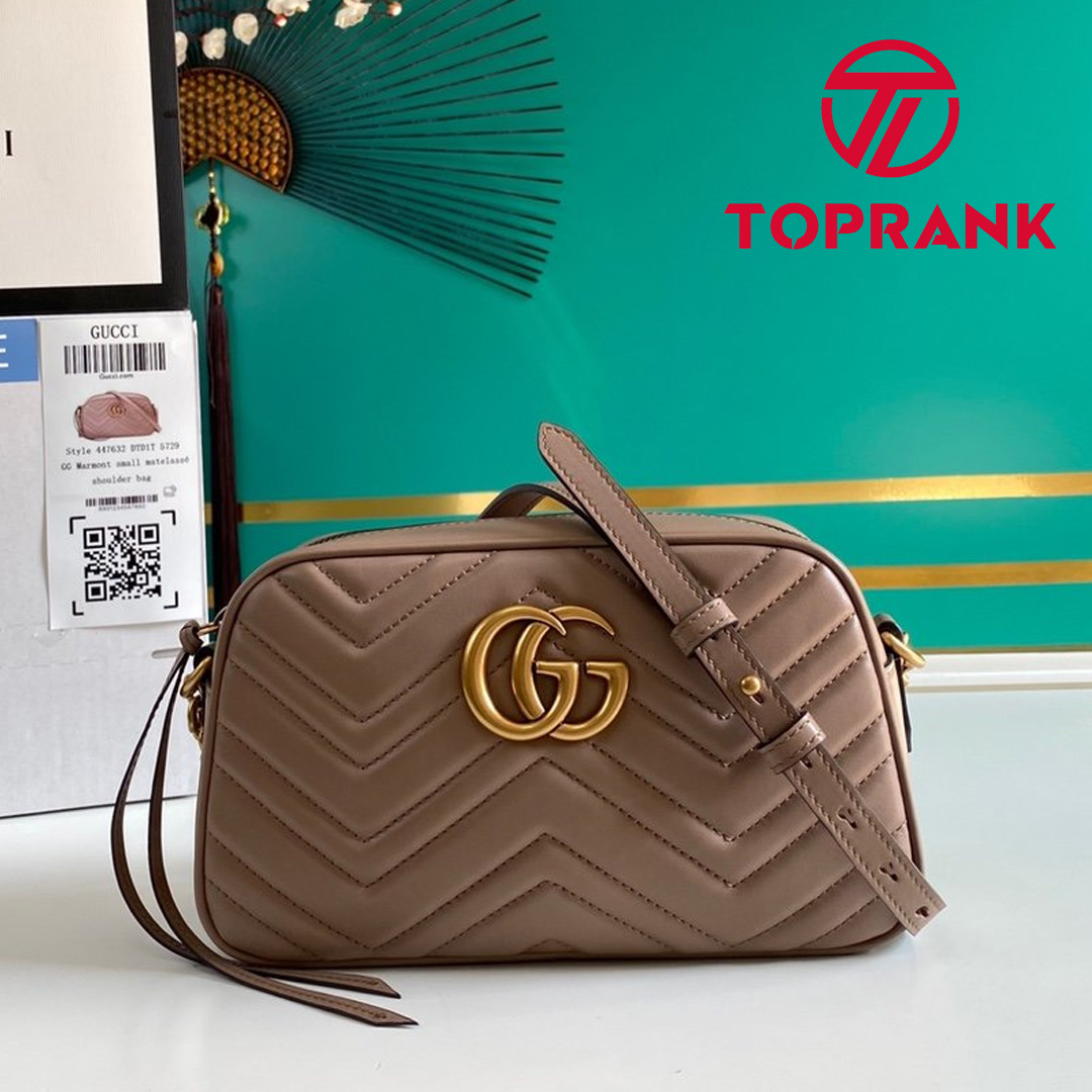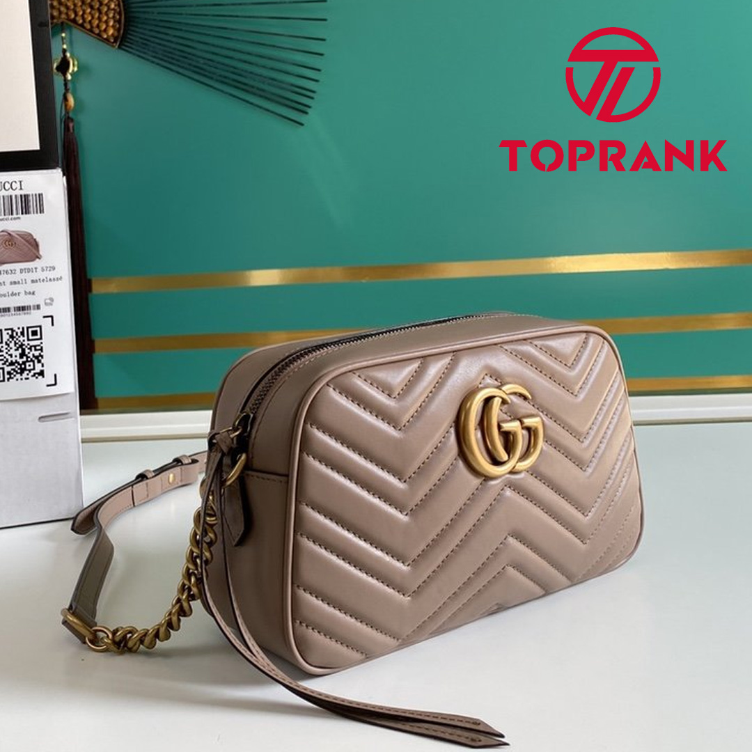 The small GG Marmont chain shoulder bag has a softly structured shape and a zip top closure with the Double G hardware. The chain shoulder strap has a leather shoulder detail. Made in matelassé leather with a chevron design.