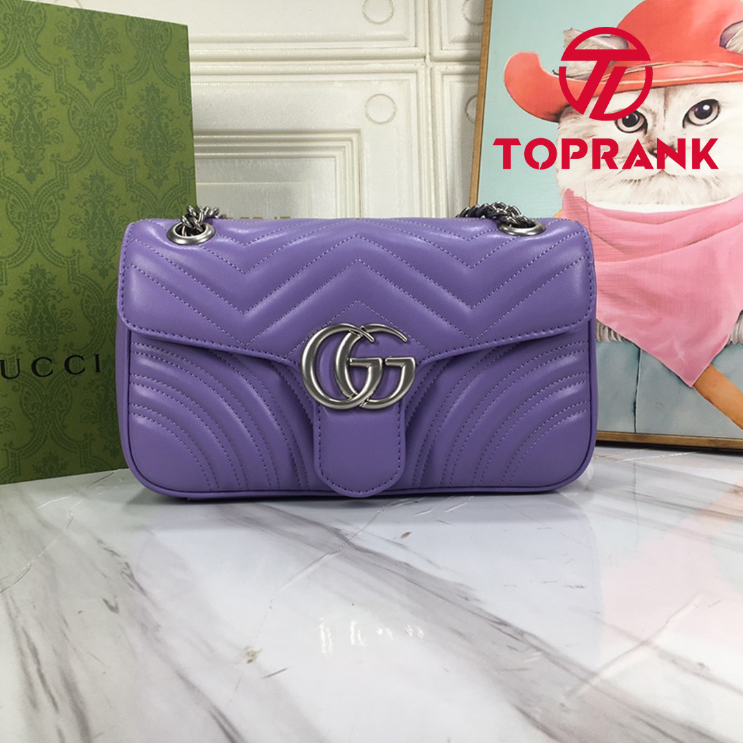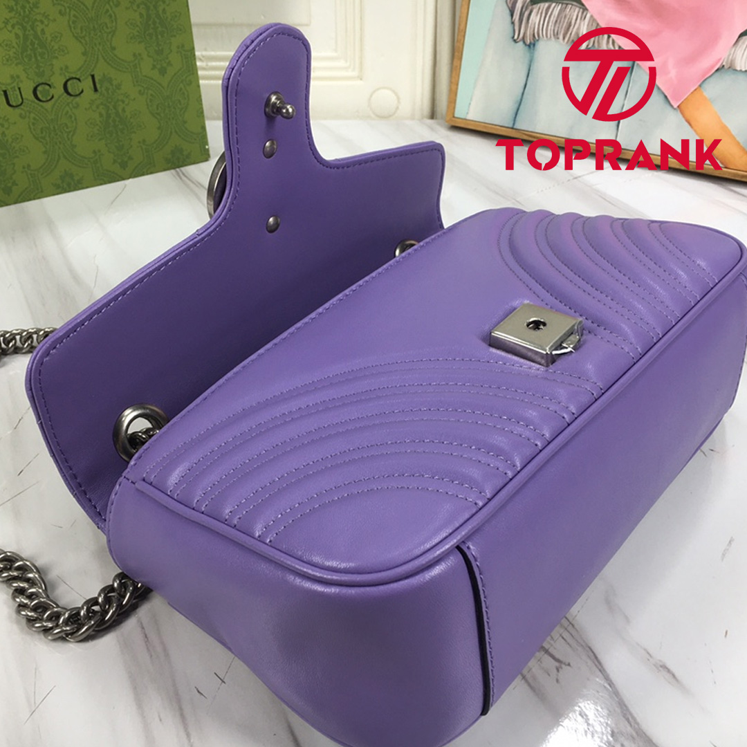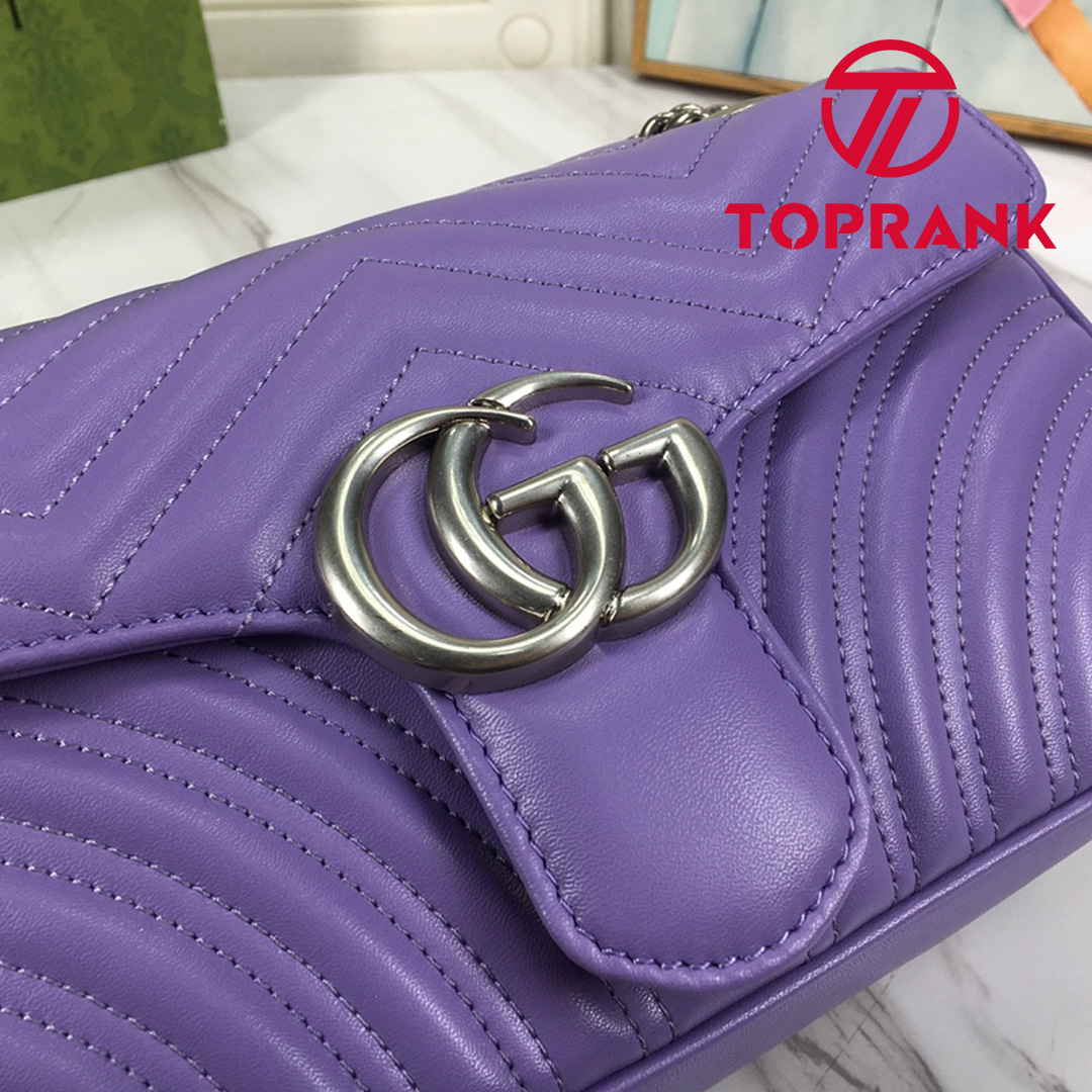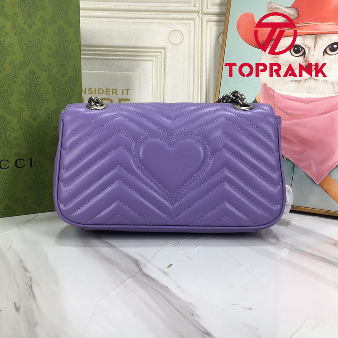 In soft, vibrant hues, pastels continue to be explored throughout the latest collections. Made in matelassé chevron leather with a heart on the back in a light shade of lilac the now recognizable small GG Marmont chain shoulder bag has a softly structured shape and a flap closure with Double G hardware. Designed to be worn multiple ways, the chain strap slides to change between a shoulder and a top handle bag.