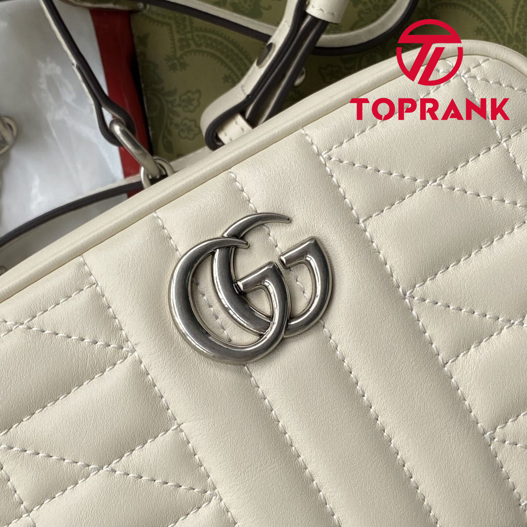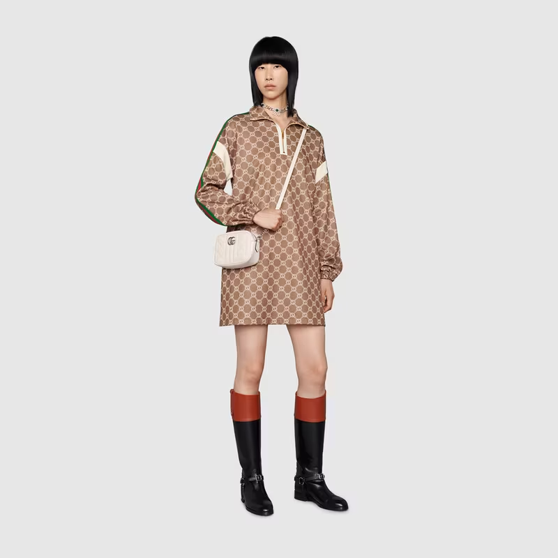 The GG Marmont is characterized by the brand's emblematic monogram hardware and matelassé leather. For The Gucci Aria collection, the style is reimagined with a new geometric approach to the signature material while its Double G hardware is presented with an antique silver-toned finish. The design appears here in the shape of a small shoulder bag in white.