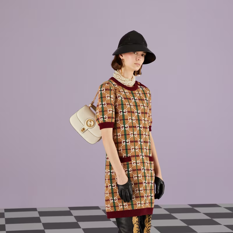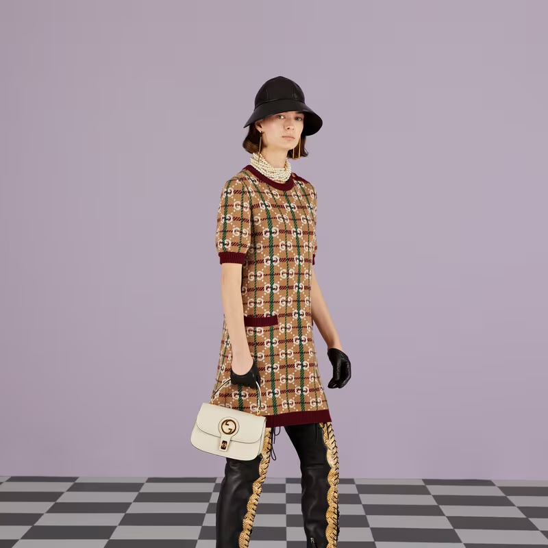 Taking inspiration from the House's archives, a geometrically shaped version of the Round Interlocking G logo sits atop this small top handle bag. The gold-toned hardware adds a defined vintage feel to the style, enriching the design with a timeless feel. The white leather style is completed by two interchangeable shoulder straps, in tonal leather or gold-toned metal chain.