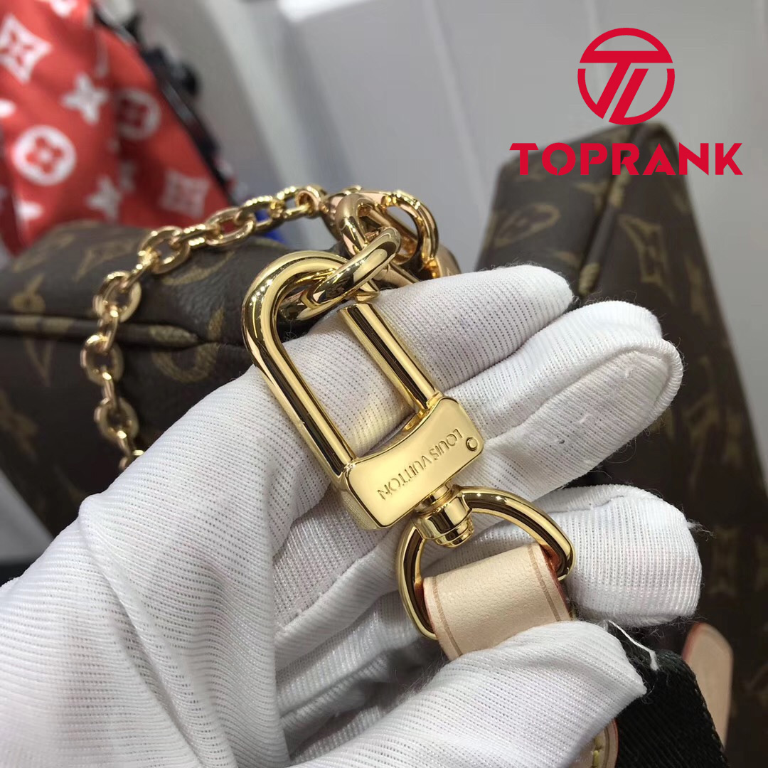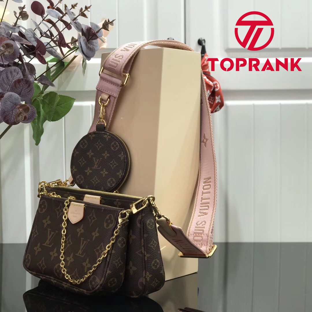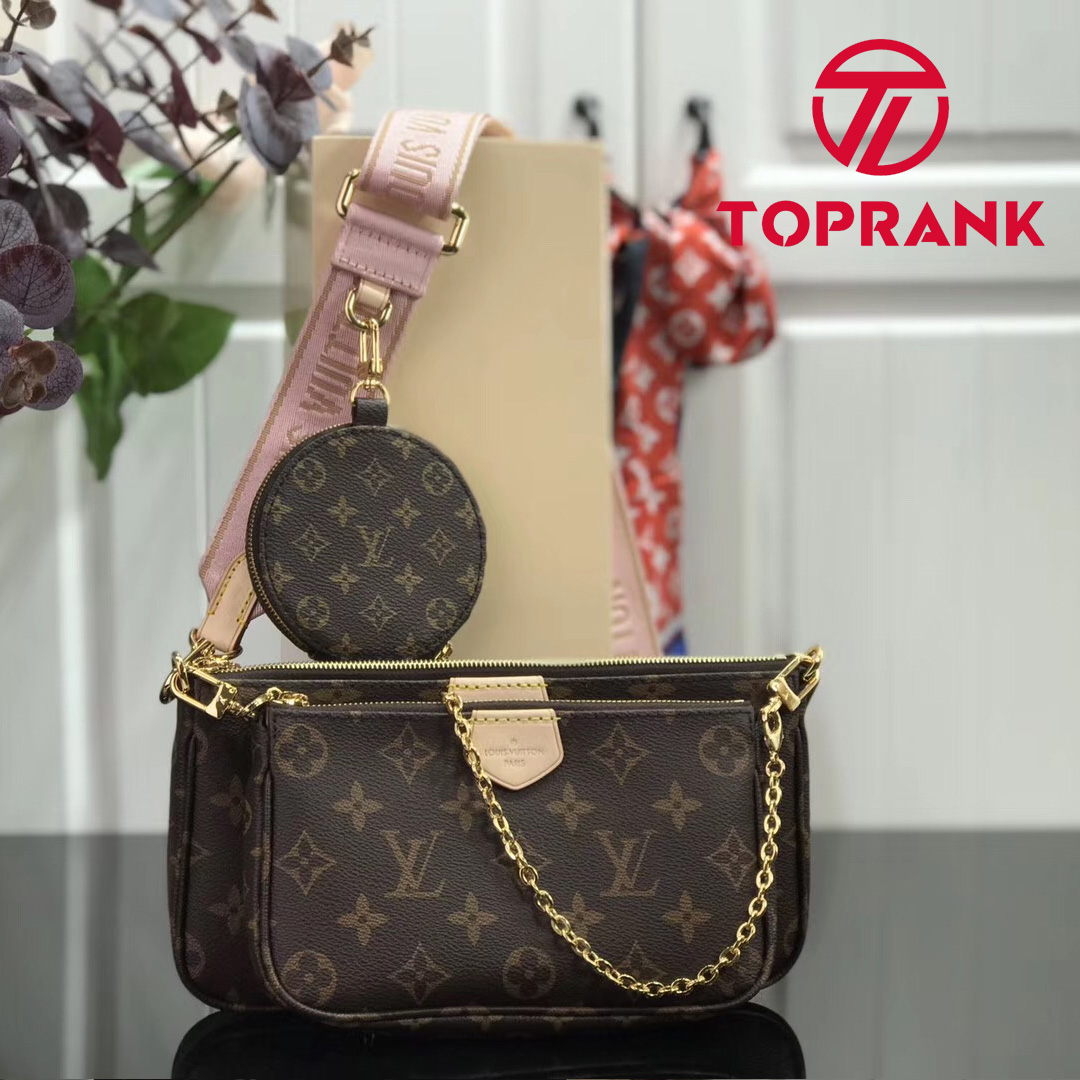 The Multi Pochette Accessoires is a hybrid cross-body bag with multiple pockets and compartments that brings together a Pochette Accessoires, a Mini Pochette Accessoires and a Round Coin Purse. Fashioned from Monogram canvas with a mini Monogram pattern on the sides of the two pochettes, it has both a removable gold-tone chain and an adjustable Louis Vuitton inscribed Jacquard strap for multiple carrying options.