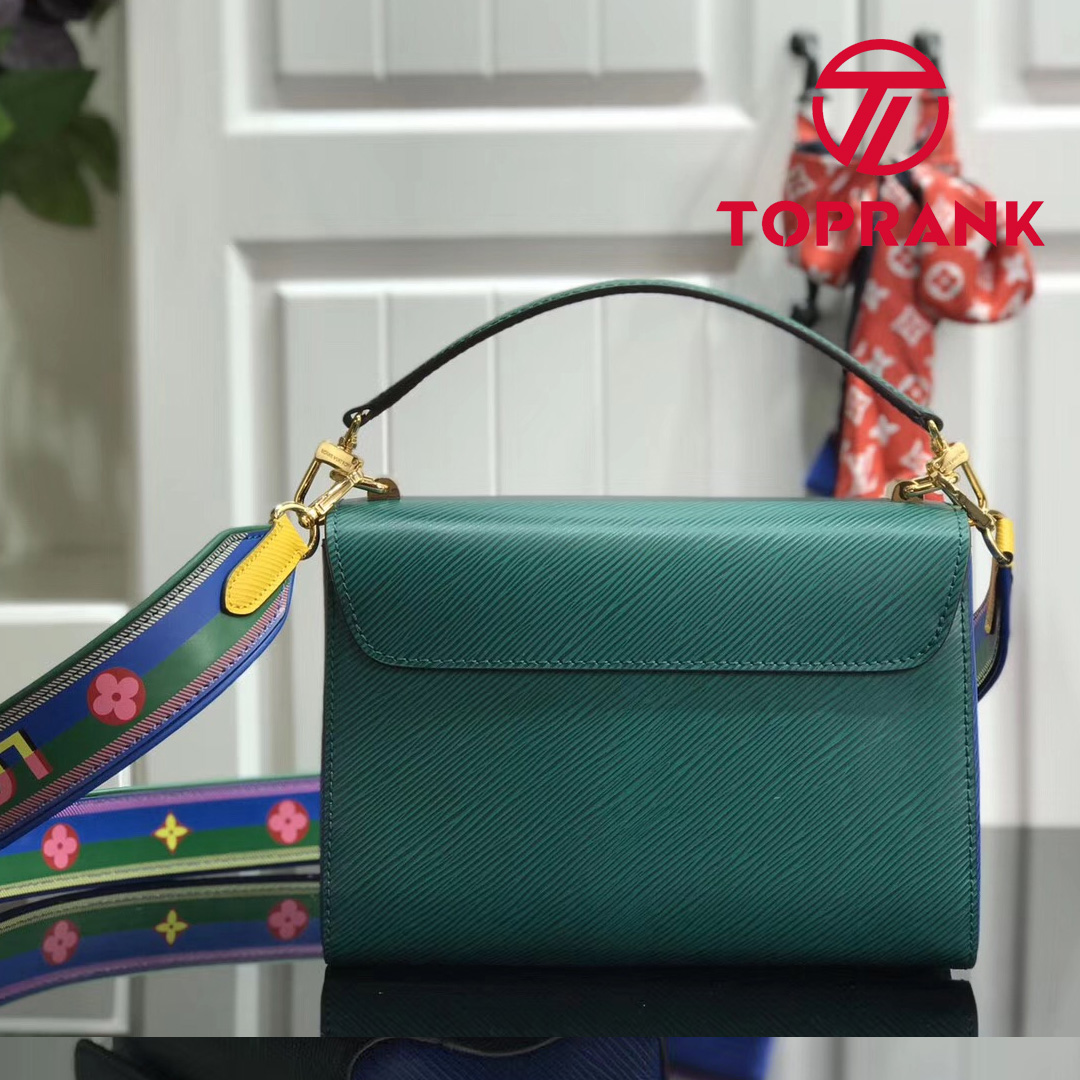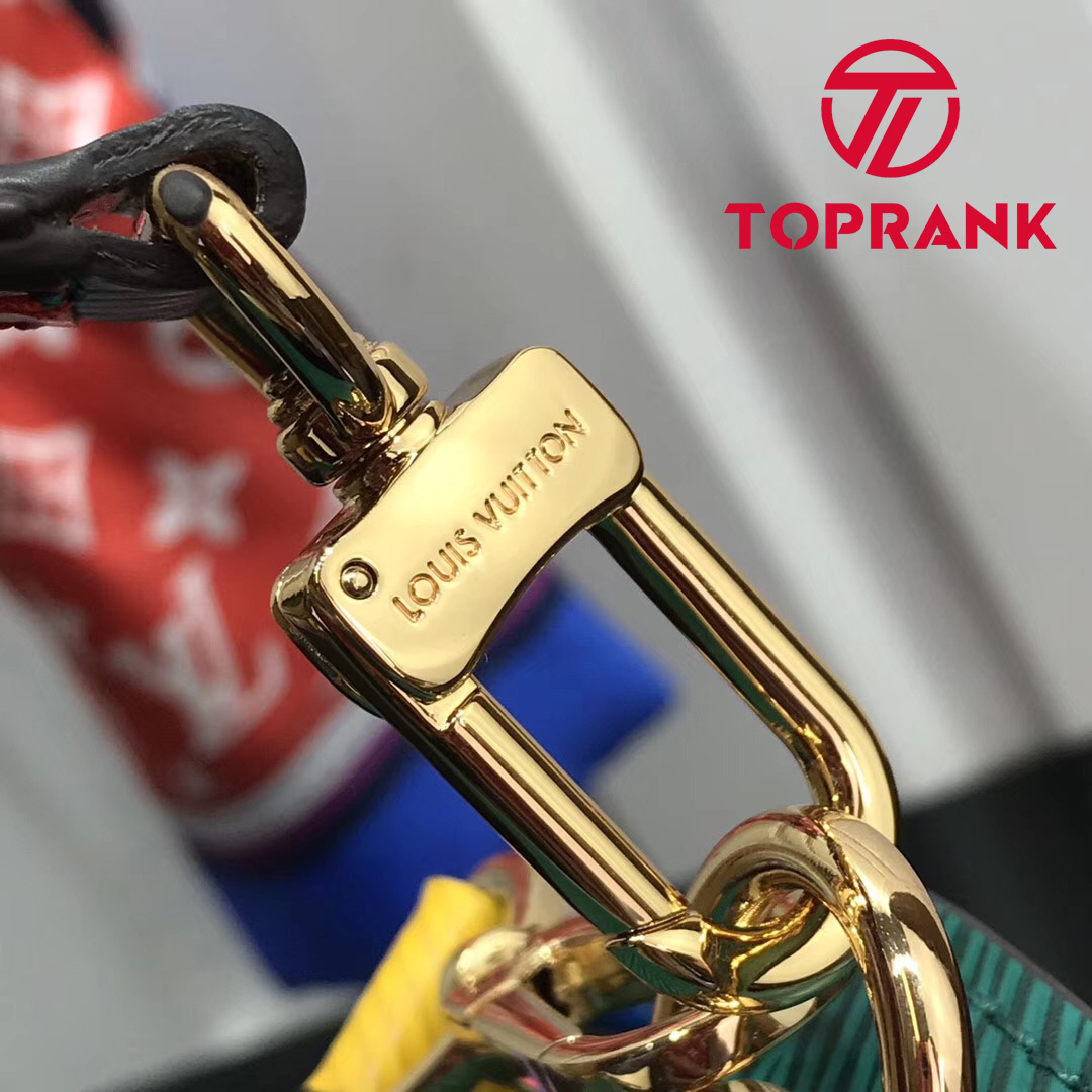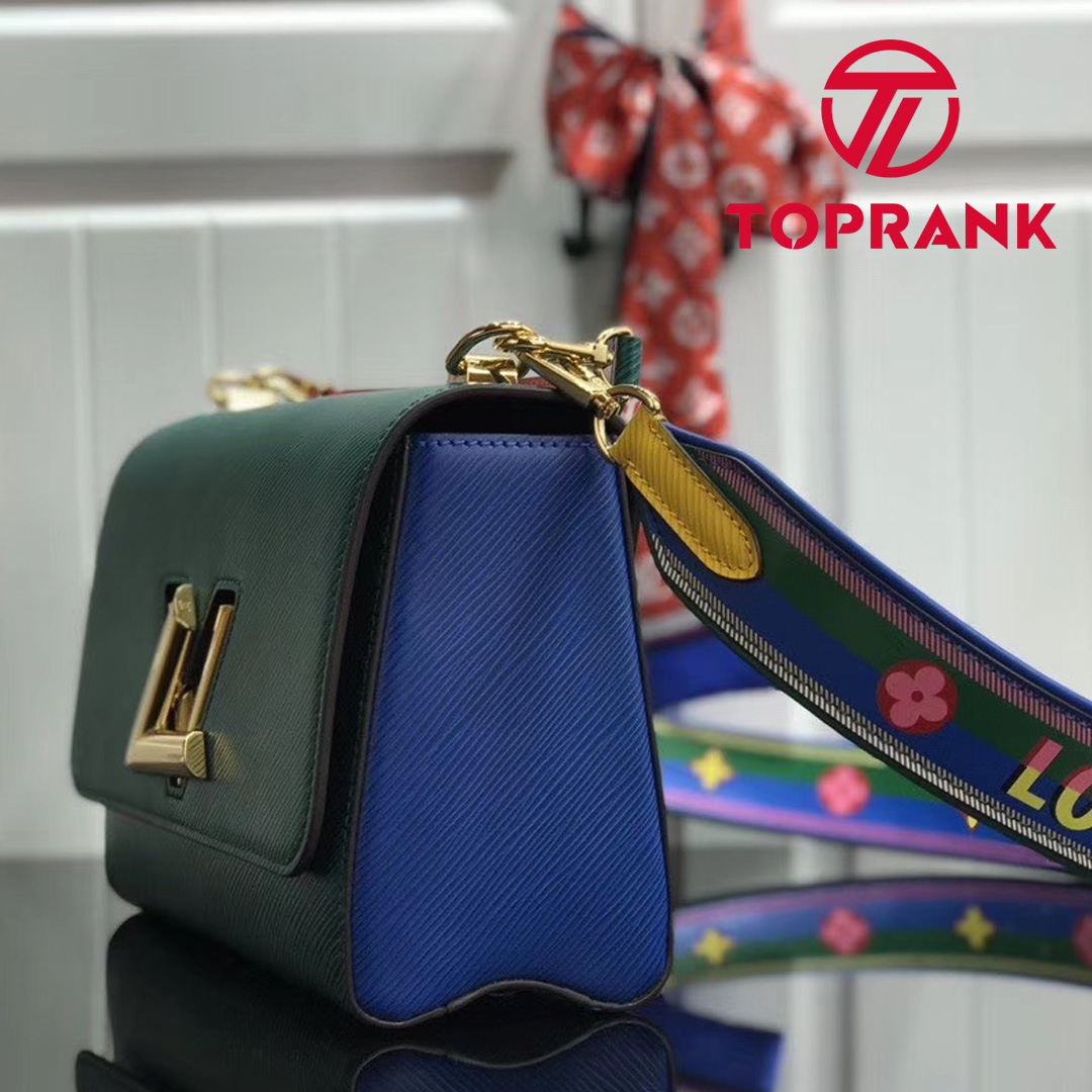The Twist Strap MM is a laid-back iteration of the New Classic bag. It features both an Epi-grained leather top handle and a wide, sporty-chic embroidered satin strap. Designed for a short cross-body carry, the strap is embroidered with \' Louis Vuitton\' on one side, and Monogram Flowers on the other. A standout style for casual or athleisure looks.
