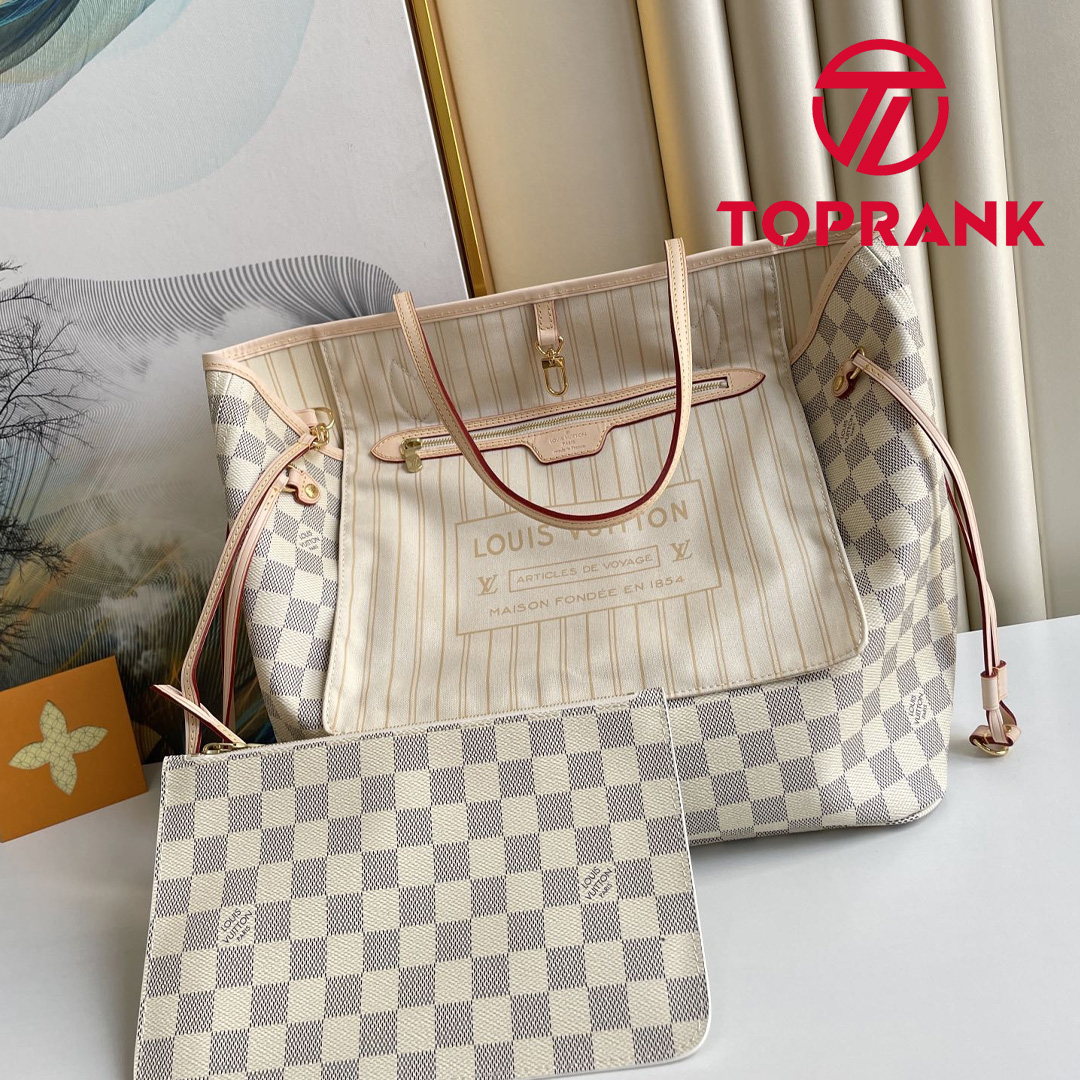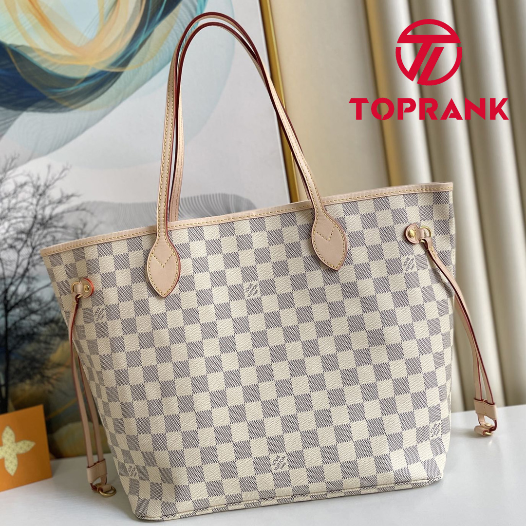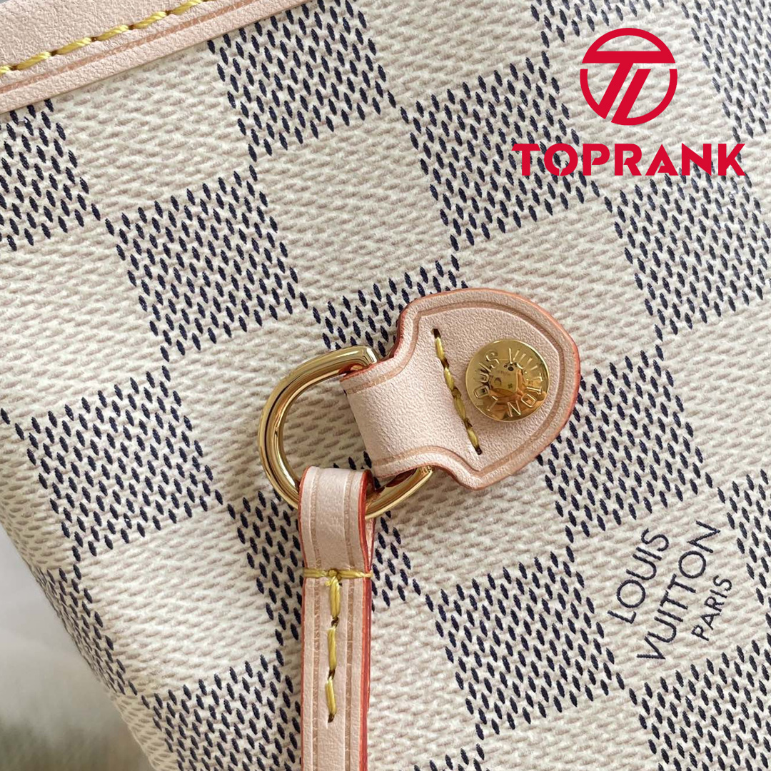 The Neverfull PM tote pairs timeless design with heritage details. Crafted from Damier Azur canvas with natural cowhide trim, it is capacious yet not bulky, with side laces that cinch for a sleek allure or loosen for a casual look. Slim, comfortable handles slip easily over the shoulder or arm. Lined in colorful textile, it features a removable pouch which can be used as a clutch or an extra pocket.