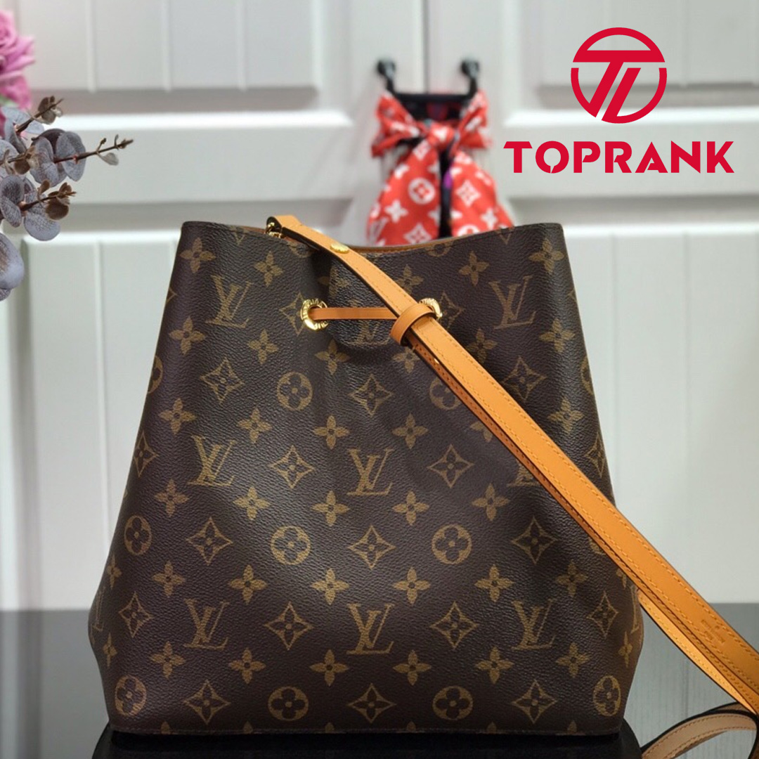 26 x 22 x 27 cm( length x height x width ) 10.2 x 8.7 x 10.8 inchesMonogram coated canvas exteriorColorful calf-leather trimColorful bonded microfiber liningGold-color metal metallic piecesDrawstring closureAdjustable long strap with press studsInside zipped pocket