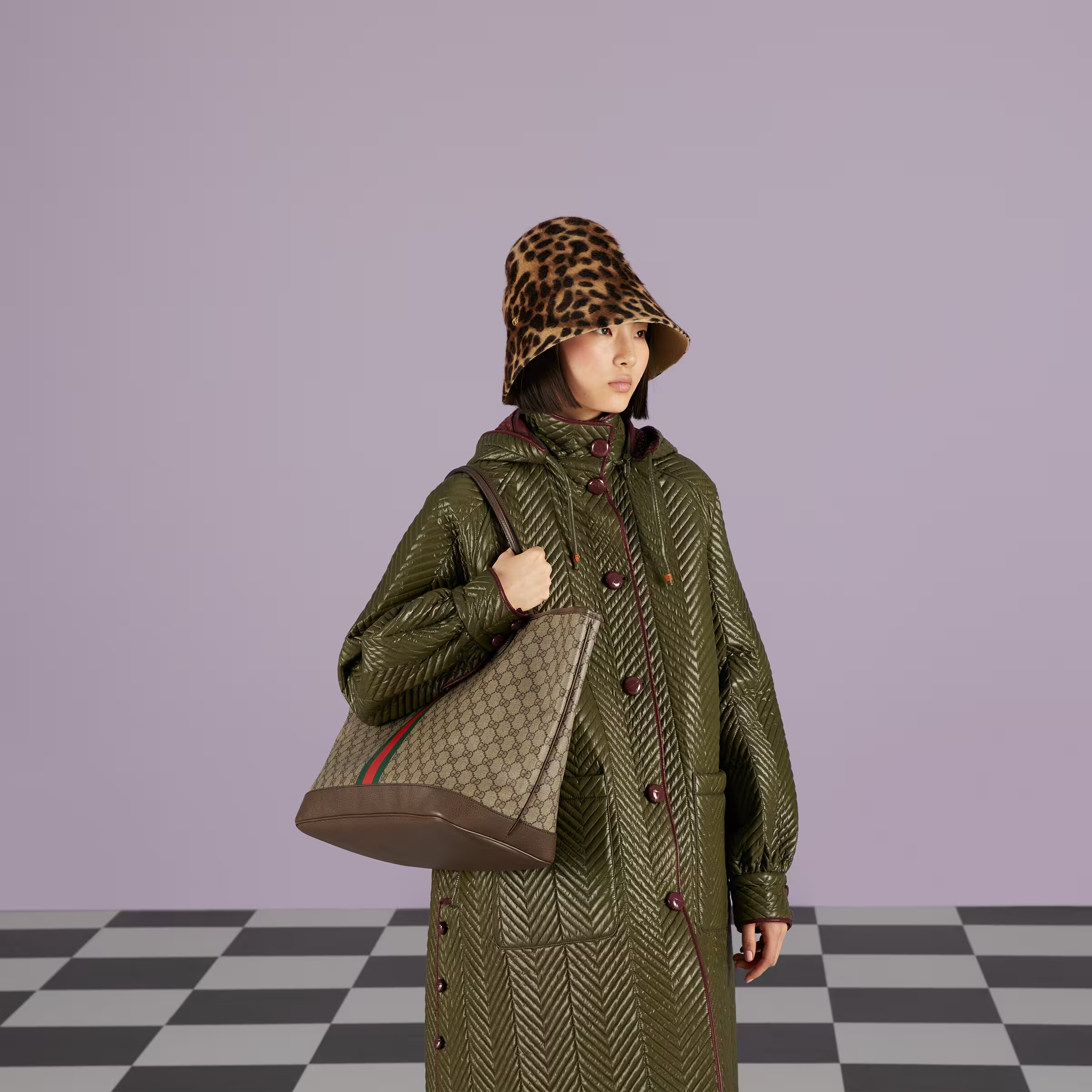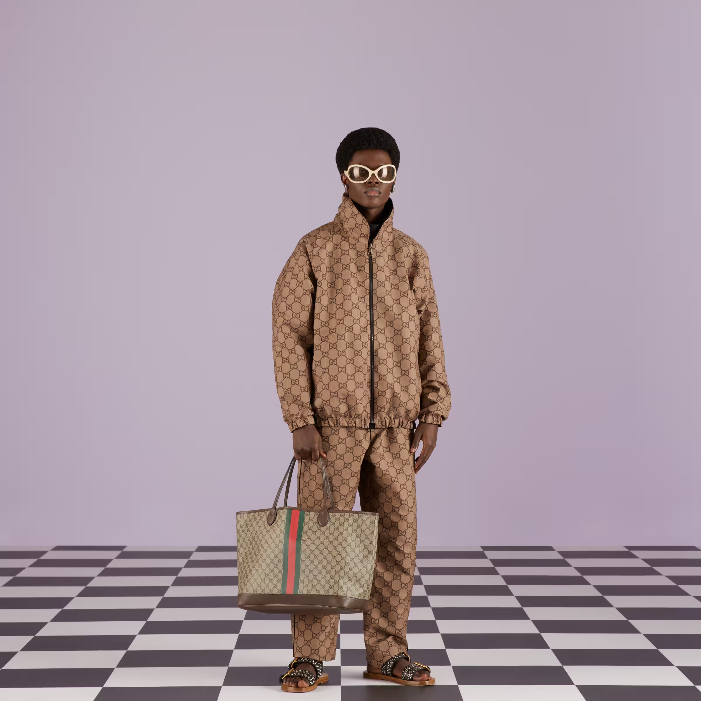 House collections continue the idea that pieces should be timeless and not just in fashion for one season. Guccio Gucci's everlasting monogram continues to enrich new designs with a logo feel. This Ophidia tote bag is presented in classic beige and ebony GG Supreme canvas, complete with the green and red Web stripe.
