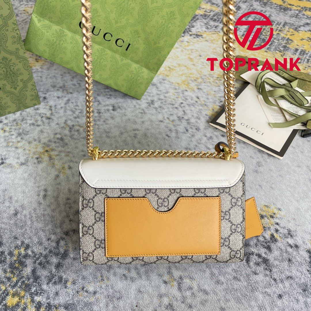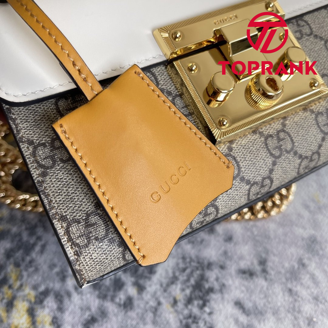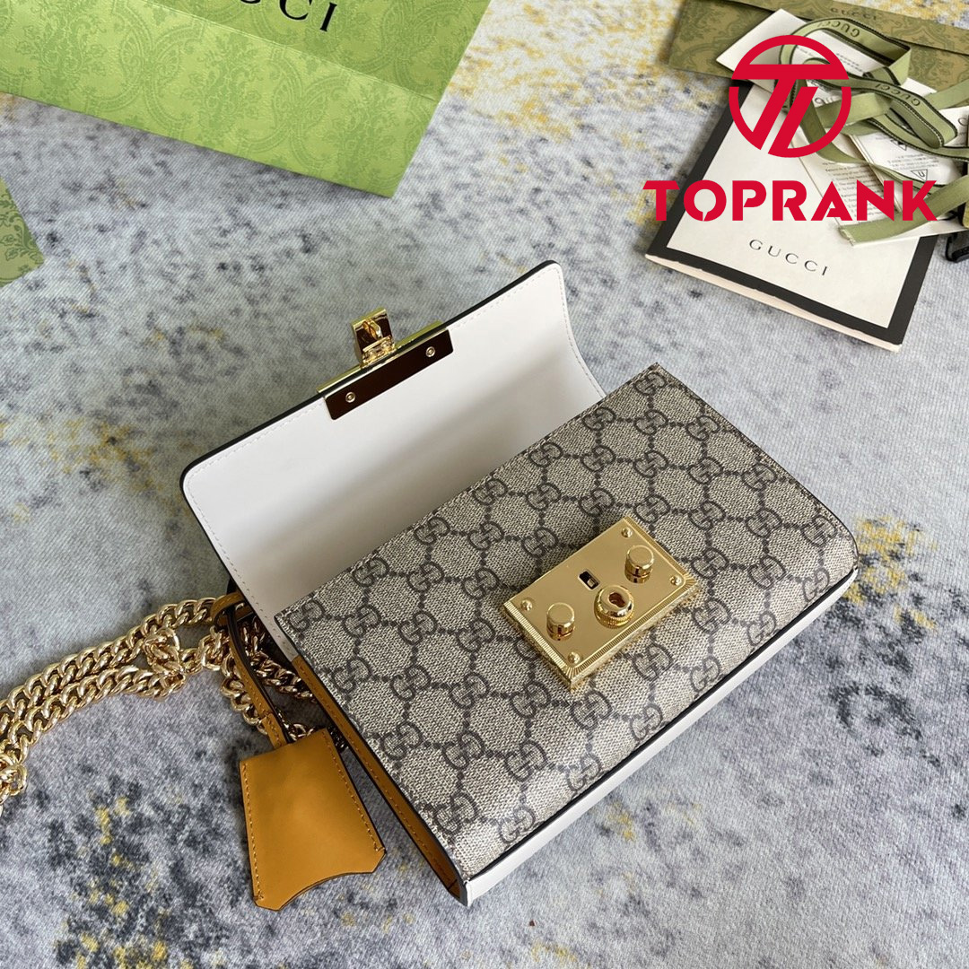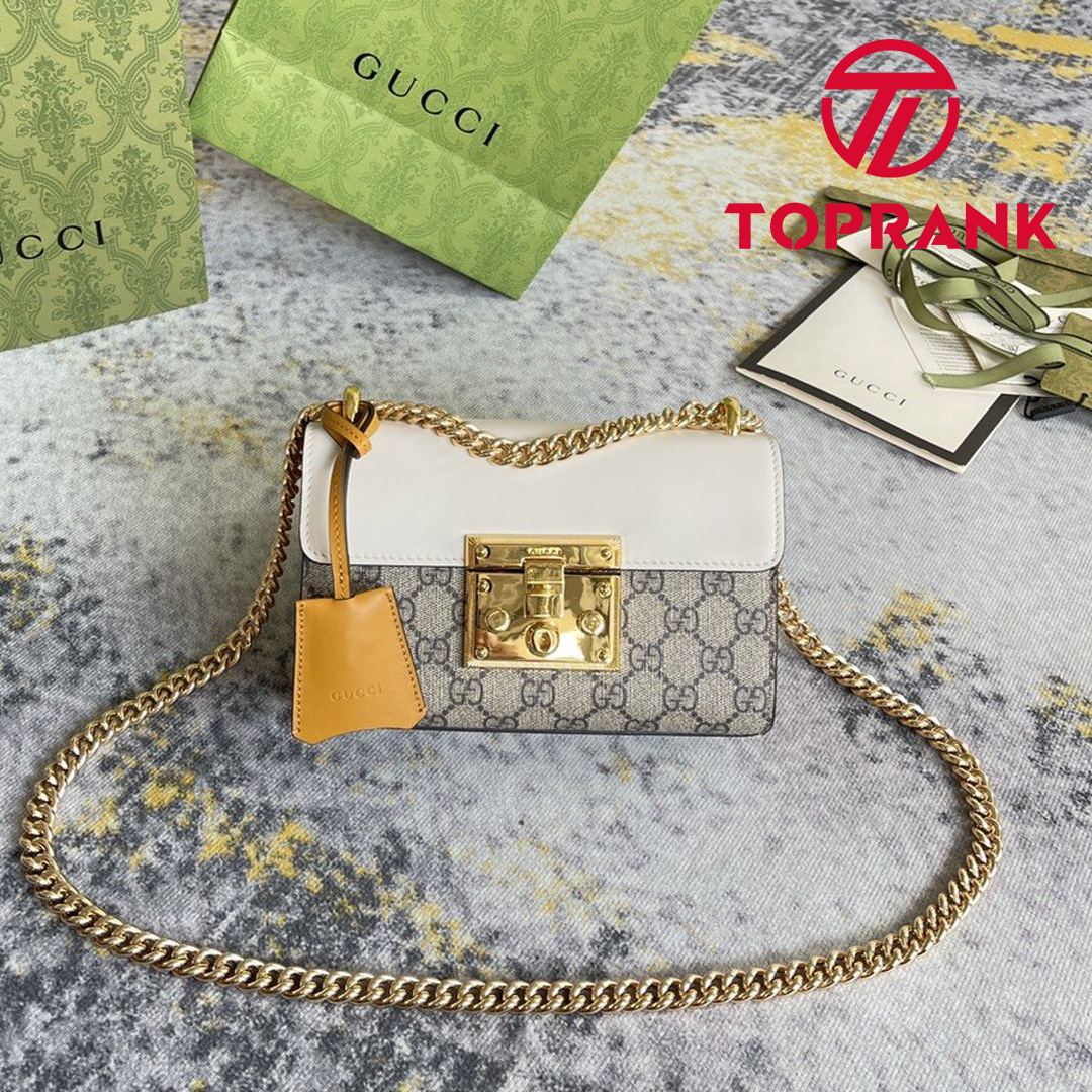 The structured Padlock small shoulder bag is crafted in GG Supreme canvas and white leather.The bag features the collection's signature padlock closure, reminiscent of the brand's design roots in the casual luggage world.